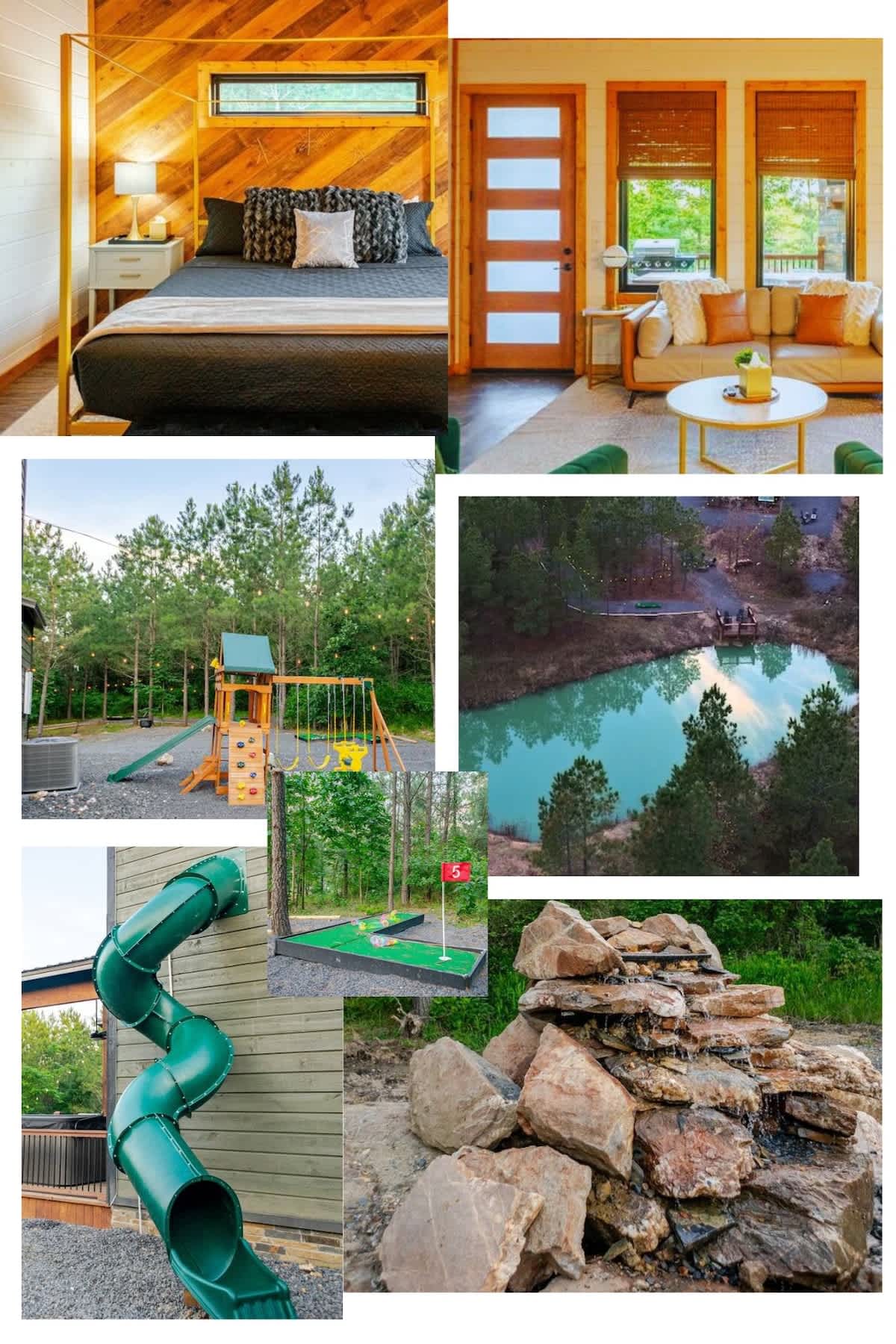 Enjoy a serene pond, 9-hole mini-golf, playground, giant Lite Brite, two arcades, and an exhilarating slide. Unwind by the fire pit, relax in the 5–6 person hot tub, or marvel at the mesmerizing waterfall. A cozy kid's loft and welcoming atmosphere complete thi....