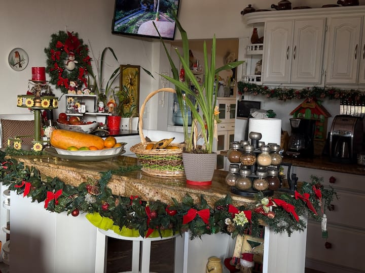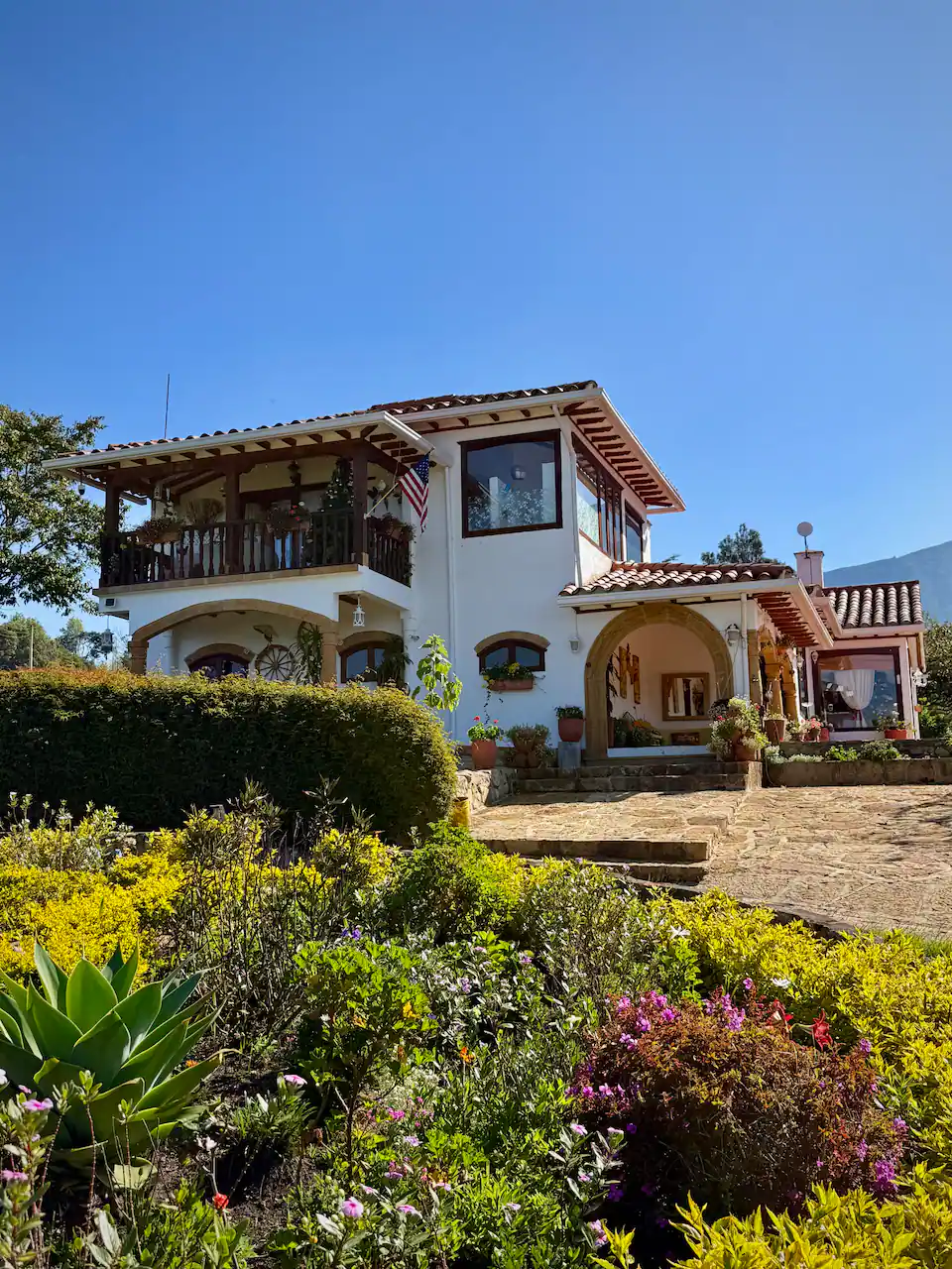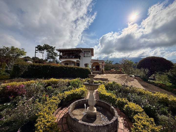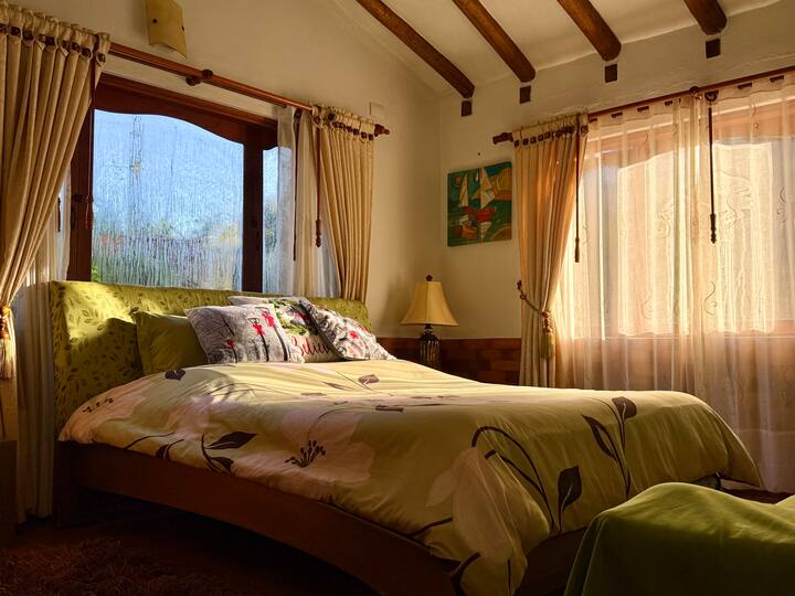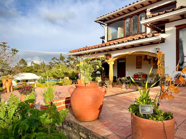 Looking for a special stay in Villa de Leyva? Our beautiful Queen Suite with private bathroom offers a cozy and comfortable experience. Wake up to stunning views of the mountains in a top-notch nature lodge, perfect for couples or single travelers + delicious breakfast included. Relax in the floating kiosk by the private lake, enjoy beautiful gardens, animals, basketball court, ping pong & more. Available upon request: Lunch, BBQ, dinner by the fireplace, shu....